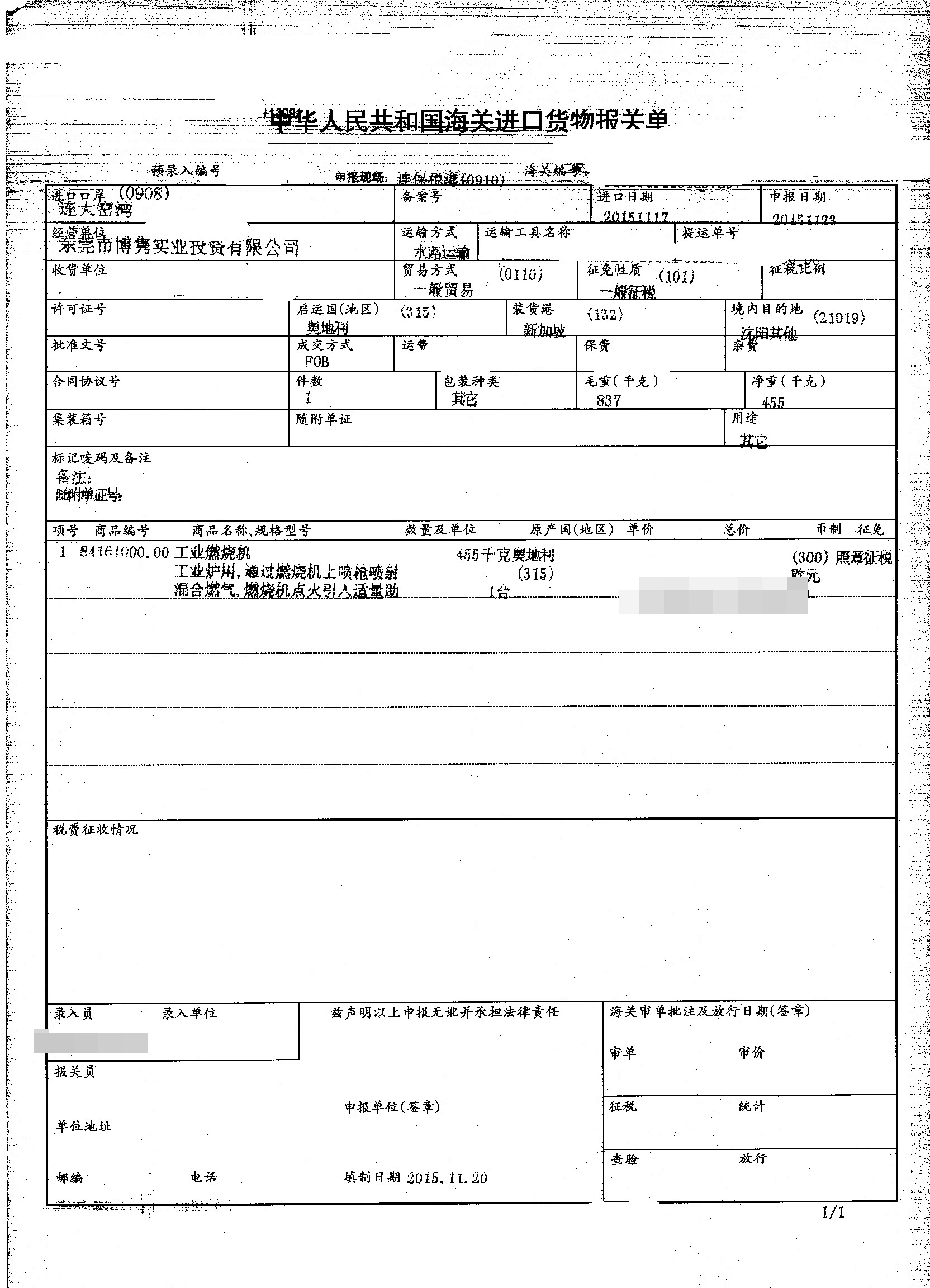 三、工業(yè)燃燒機(jī)進(jìn)口報(bào)關(guān)案例展示