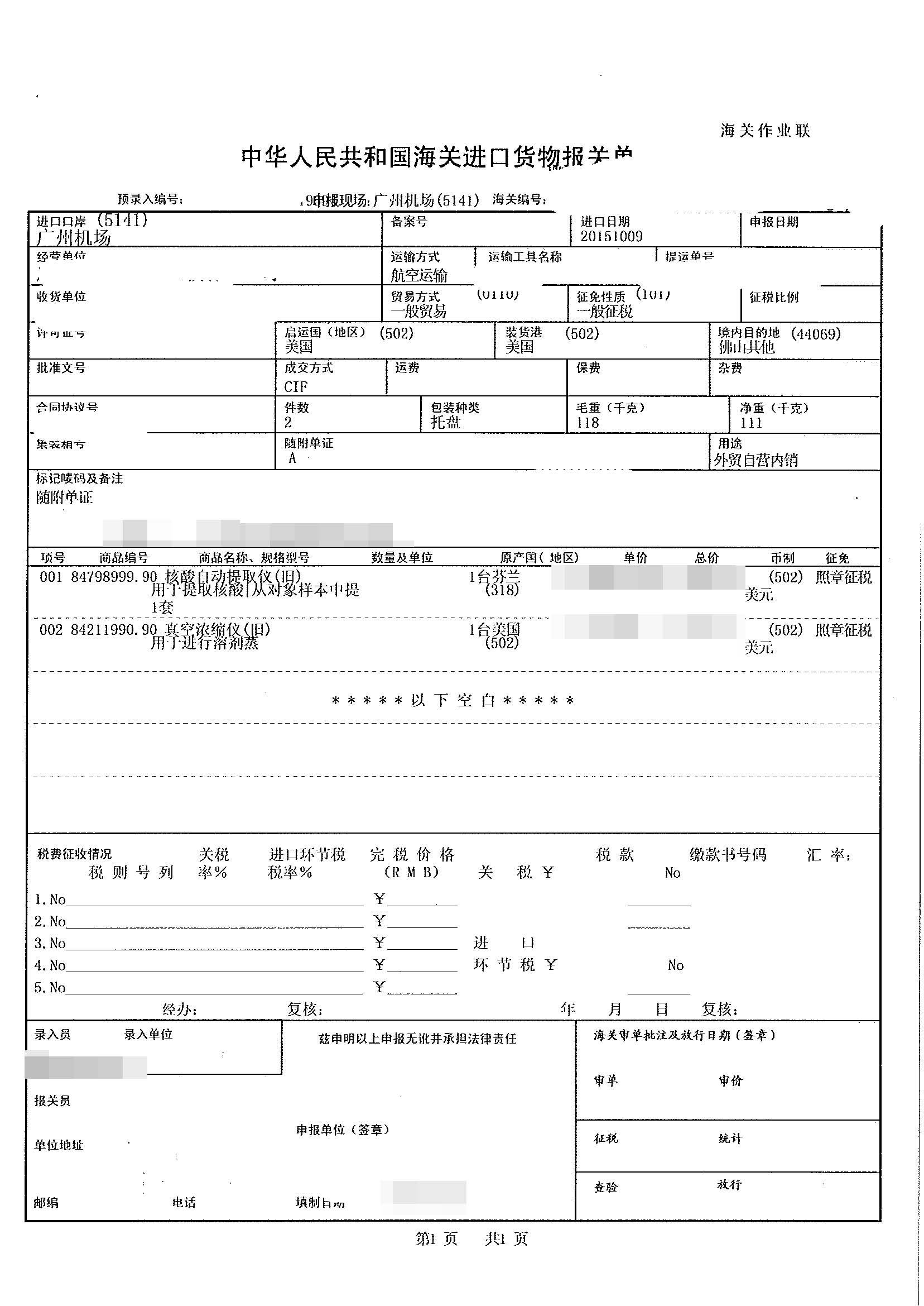 進(jìn)口日期:20151009客戶:廣東某生物科技有限公司