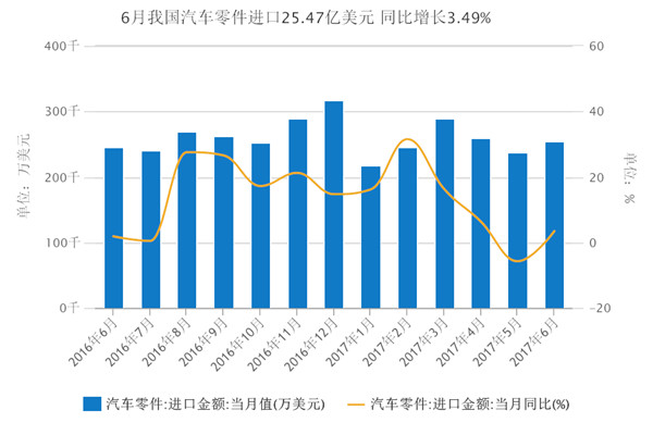 博裕機械進口報關行獲悉,2017年6月我國汽車零件進口金額達25.47億美元,當月同比增長3.49%;累計進口金額達150.32億美元,累計同比增長10.2%。