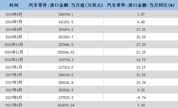 以下為2016年6月—2017年6月我國汽車零件進口金額統(tǒng)計:
